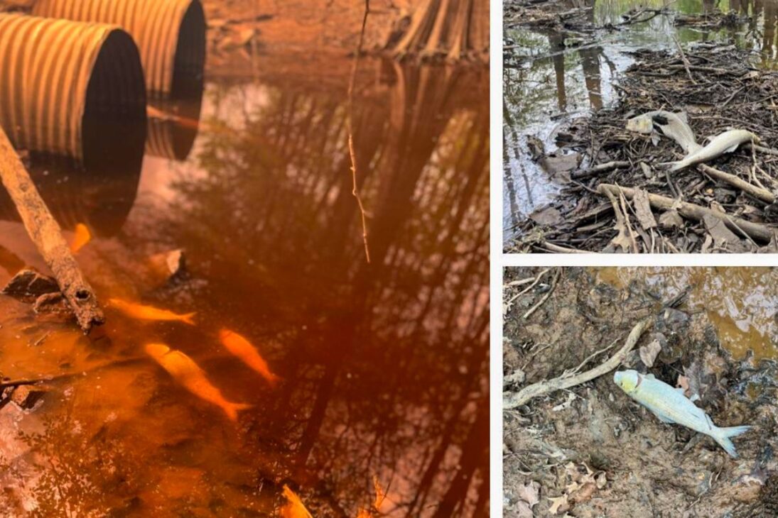 Cuando alcantarillas subdimensionadas y estructuras obstruidas por escombros impiden el drenaje, el agua queda atrapada. Y el agua atrapada se convierte en otro mundo químico y biológico. El oxígeno se disuelve menos, baja rápidamente, y los peces migratorios que han ingresado a la llanura para desovar o alimentarse terminan aislados en charcos estancados.