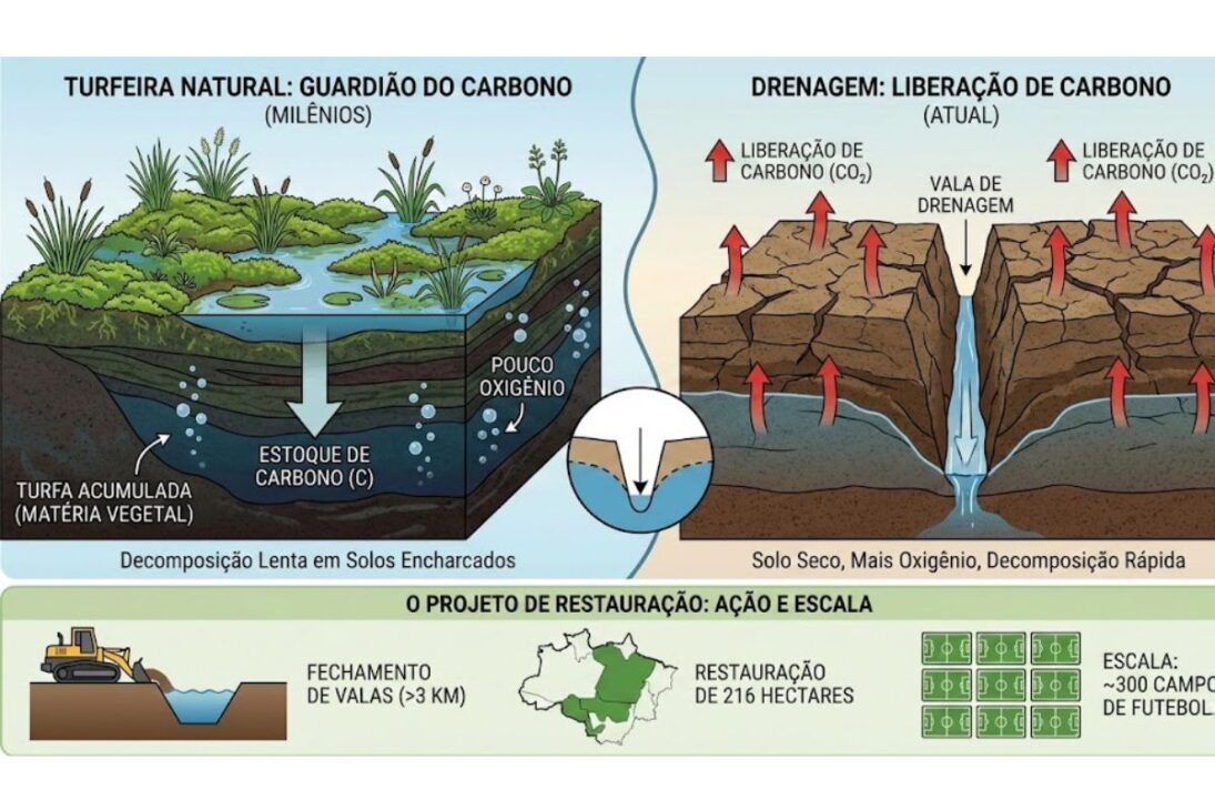Cuando el pantano es drenado, la turba se seca y empieza a liberar carbono. Las zanjas no afectan solo el canal excavado, sino toda el área alrededor, porque rebajan el manto freático y transforman suelos húmedos en superficies secas.