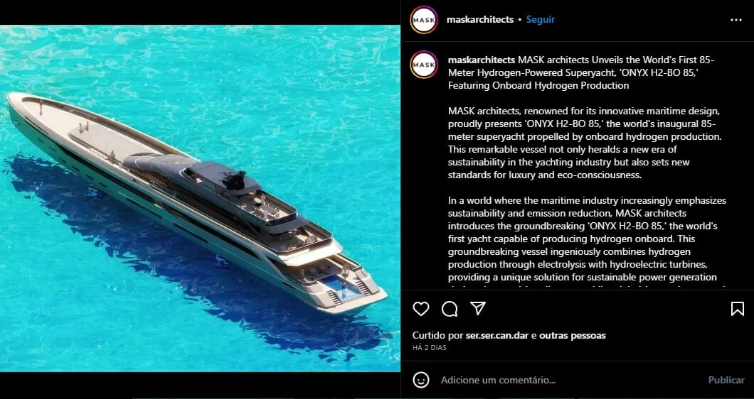 El ONYX H2-BO 85, De MASK Architects, Es El Primer Super Yate Del Mundo Capaz De Moverse Por Su Propia Producción De Hidrógeno. El Modelo Combina Electrólisis, Utilizando Agua De Mar, Con Turbinas Hidroeléctricas Para Generar Una Solución De Energía Sostenible Con Enfoque En Cortas Distancias De Crucero, Lo Que No Emite Gases Nocivos Y, En Consecuencia, Reduce El Impacto Al Medio Ambiente.