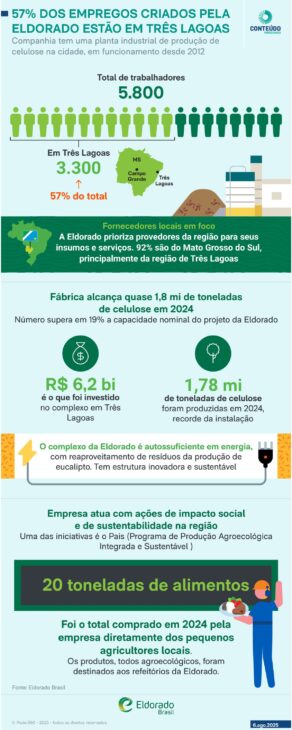 El crecimiento de Três Lagoas también se refleja en la cadena de suministros. En 2024, Eldorado contrató 690 proveedores, siendo que el 92% de ellos son de Mato Grosso do Sul. La empresa prioriza la contratación local y ofrece entrenamientos técnicos y gerenciales a los socios, fomentando el desarrollo regional. Esta estrategia genera un ciclo de retroalimentación: cuanto más servicios la ciudad es capaz de ofrecer, más empresas se interesan en instalarse en el municipio.