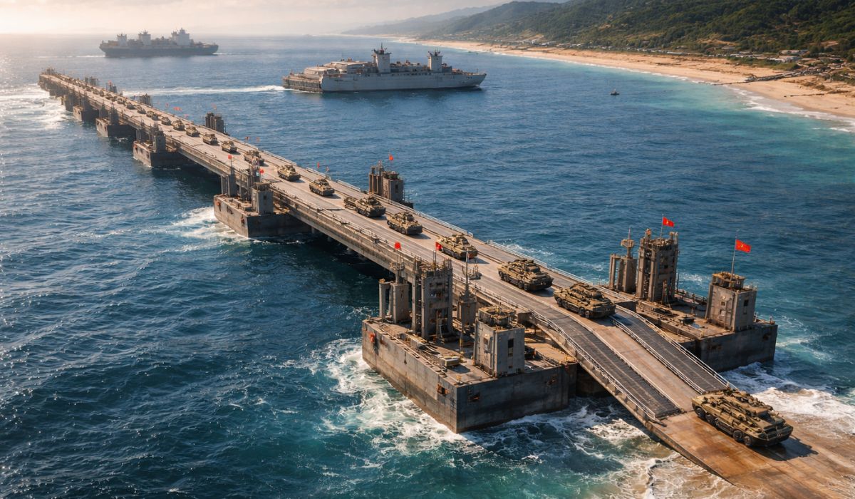 China ha colocado en el mar misteriosas barcazas de invasión con rampas gigantes que se conectan como piezas de Lego y pueden formar puentes flotantes de casi 1 km para llevar vehículos blindados directamente a la playa, en una especie de arma secreta para Taiwán.