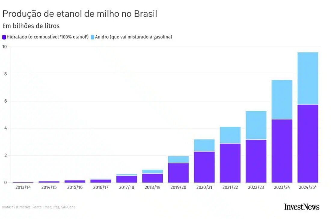 Un cambio estructural en el sector de biocombustibles consolidó el etanol de maíz como destaque en Brasil. Actualmente, él ya responde por el 20% de la producción nacional, con 7,5 mil millones de litros en 2024, según la EPE (Empresa de Pesquisa Energética).