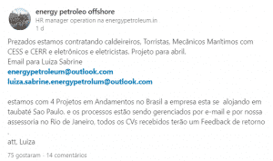 A pesar de haber publicado estas vacantes (DE LAS CUALES NOS ARREPENTIMOS MUCHO), Contactamos A CEPEM Para Verificar La Veracidad De La Información. Ella Llamó A La Sede Oficial De Energy Petroleum En Estados Unidos Y Ellos Dijeron Que No Hay Operaciones En Curso En Brasil. Indagada, Nuevamente Públicamente Por Nosotras Y Otras Personas Tras El Engaño Descubierto, Los Estafadores Borraron El Perfil Y Eliminando Todas Las Publicaciones.