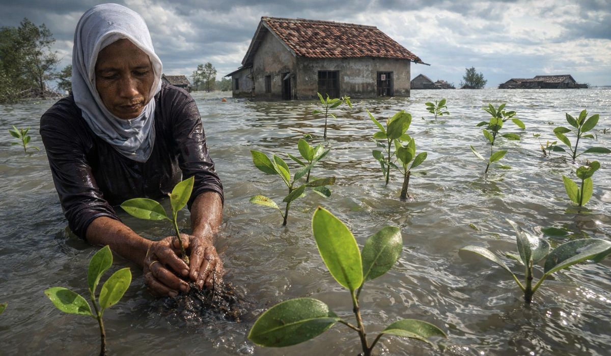 Mientras el mar engulle aldeas enteras en Indonesia, una mujer planta 15 mil manglares al año para intentar salvar sola la última casa que aún resiste al agua.