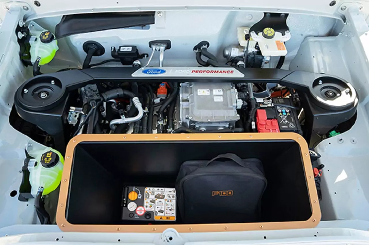 El interior ha sido desarrollado por Ford para combinar piezas de la época, como ventanas de accionamiento manual y elementos modernos del Mach-E, incluyendo una enorme pantalla multimedia. El capó del modelo con motores eléctricos, en lugar del propulsor común, cuenta con un espacioso maletero.
