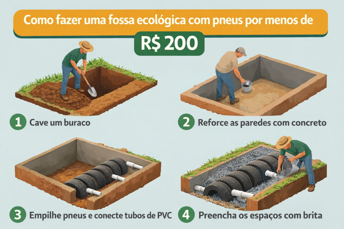 Fosa ecológica hecha con neumáticos de camión puede costar menos de R$ 200, trata aguas residuales domésticas con bacterias y filtración natural y surge como alternativa barata al saneamiento rural.