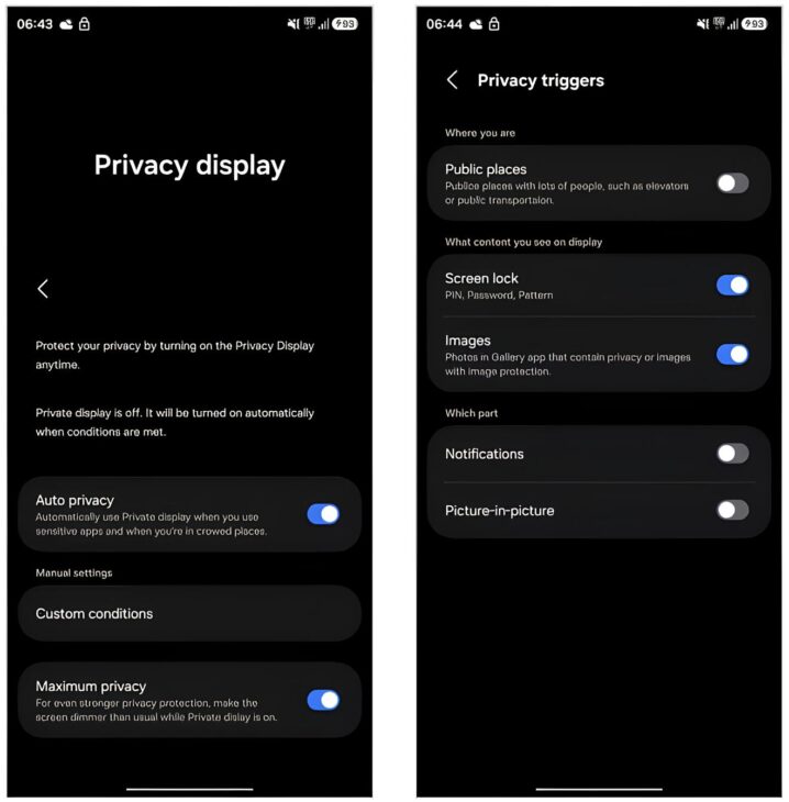 En la práctica, la tecnología crea una especie de “escudo invisible”, ajustando dinámicamente los píxeles de la pantalla OLED para hacer ilegibles las informaciones cuando se ven desde ángulos diferentes a la visión frontal. Es decir, si alguien intenta espiar tus mensajes, contraseñas o datos bancarios en el transporte público o en filas, no verá nada más que distorsiones luminosas.