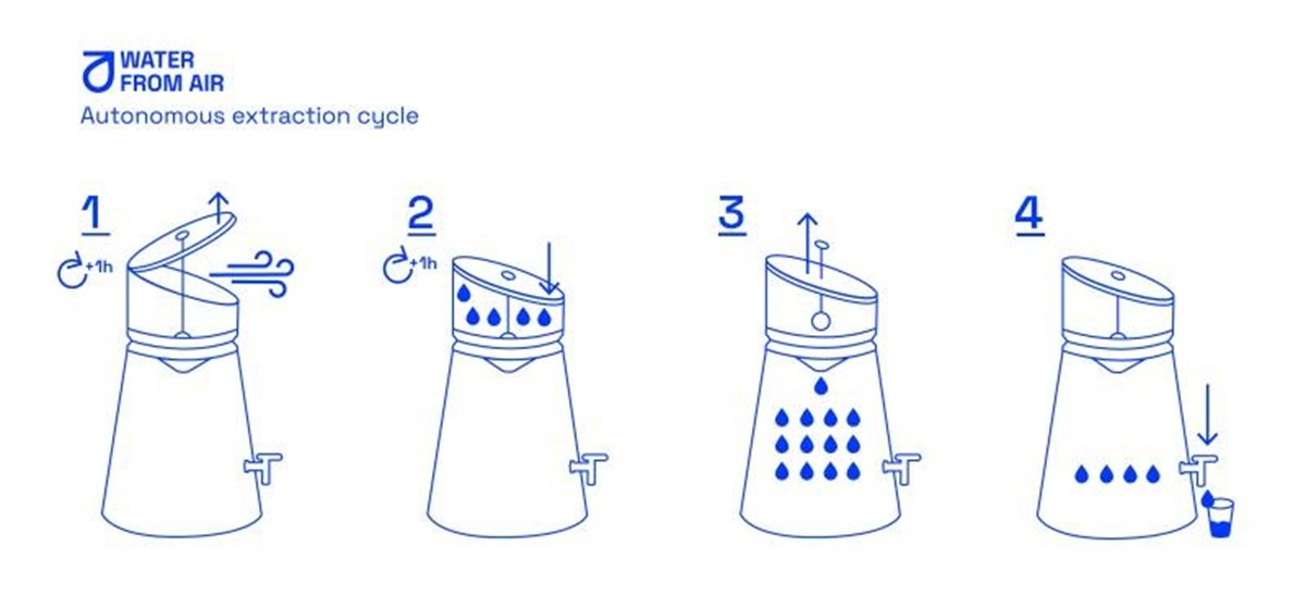 A continuación, el recipiente se cierra y la temperatura ambiente calienta el aire retenido, provocando la condensación. Las gotas de agua resultantes gotean hacia un compartimento inferior.