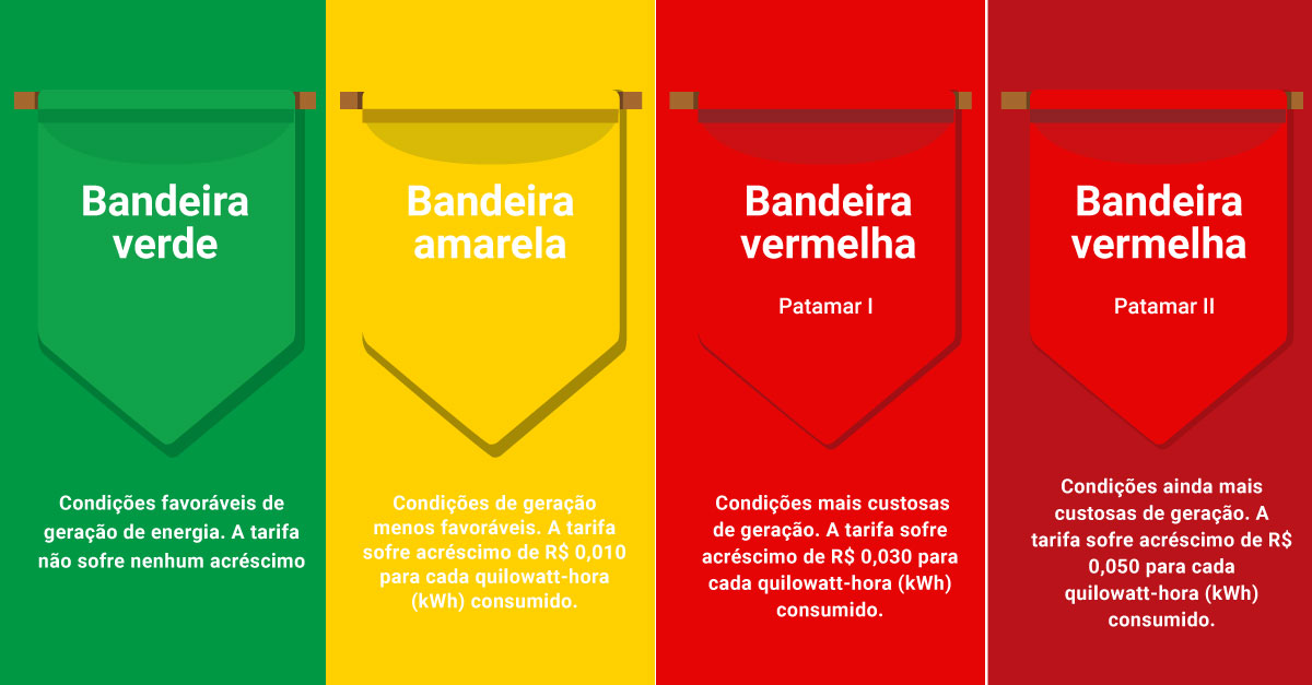La Bandera Verde indica condiciones favorables de generación y no hay ningún incremento. Ya la bandera Amarilla indica condiciones menos favorables de generación, con la tarifa sufriendo un incremento de R$ 0,01874 por cada kWh consumido. La bandera roja se divide en dos niveles, el primero presenta condiciones más costosas de generación, con la tarifa sufriendo un incremento de R$ 0,03971 por cada kWh consumido.