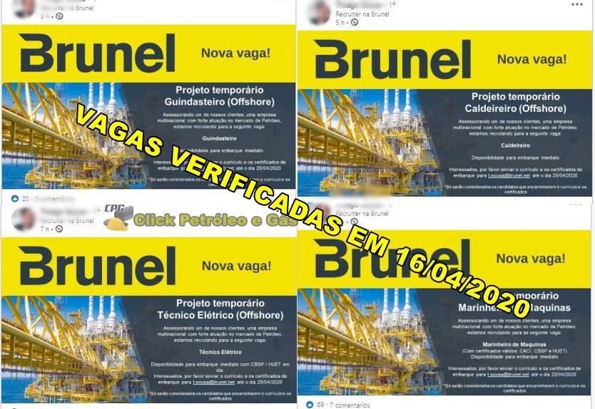 En medio de la pandemia, Brunel Reclutamiento y Selección inicia vacantes para embarque INMEDIATO con registro de currículum hasta el 20 de abril. Las oportunidades abiertas ayer (15) y hoy 16 de abril son para trabajar en una multinacional del petróleo. Soldador, Mecánico, Calderero y Técnico solicitados para vacantes en parada de mantenimiento en minera; inicio el 19 de mayo