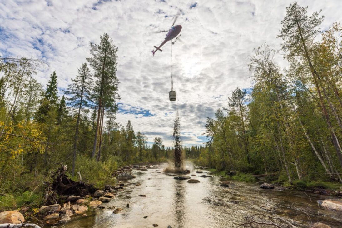 En el río Abramsån, afluente del Råne, en el área de restauración de la Laponia sueca, Rewilding Sweden lanzó por helicóptero 150 toneladas de arena y grava en septiembre de 2024 para reponer sedimentos perdidos por la explotación maderera y acelerar el regreso de la fauna bentónica, truchas, salmones y mejillones en el norte europeo.