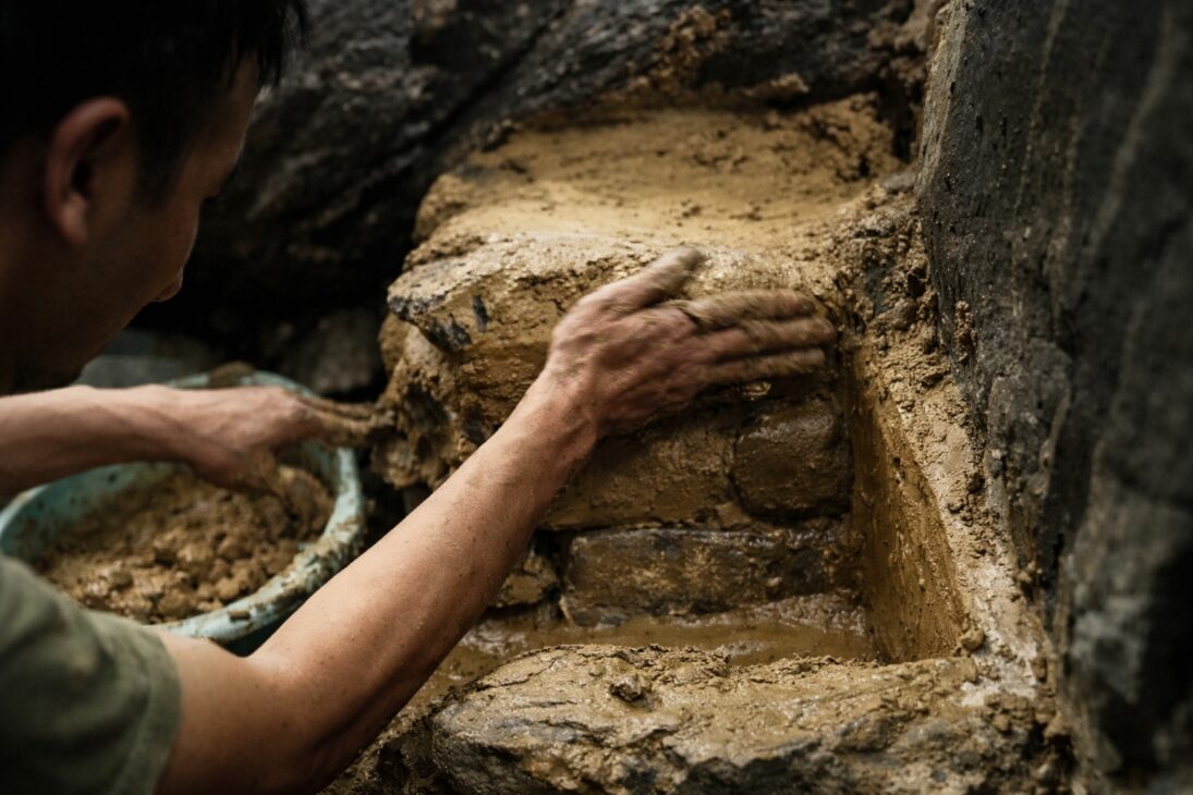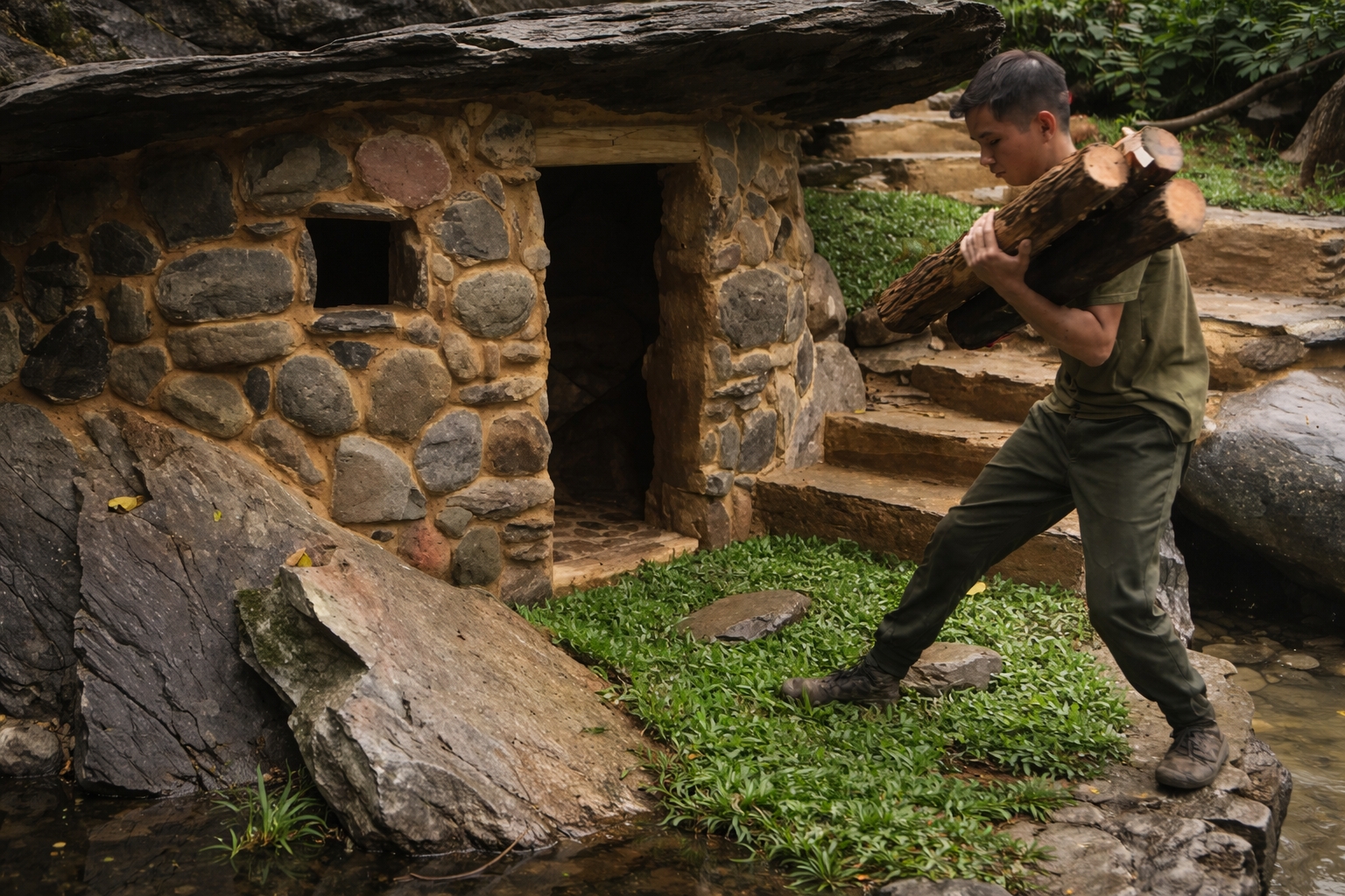 Al final, queda una sensación de que el hombre esculpe porque respeta lo que el lugar ya entrega y usa técnica de bloqueo para transformar un vano bruto en abrigo funcional, con piedra, arcilla y madera trabajando juntas.