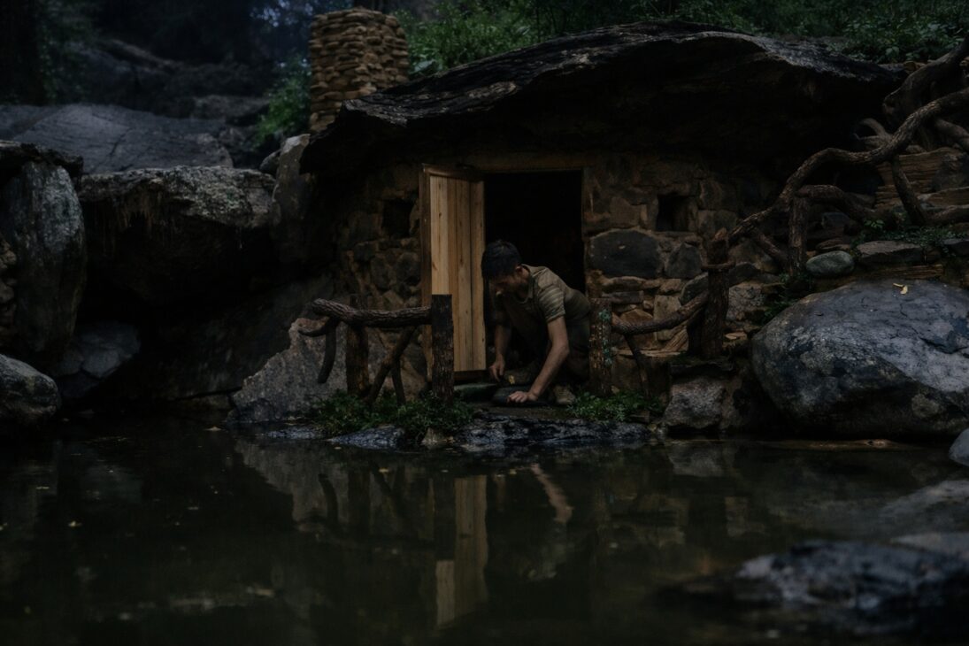 El techo no necesita ser inventado. La piedra ya resuelve esta parte. Entonces el trabajo se convierte en otro: limpiar el suelo, estabilizar la base y erigir paredes de piedra con juntas rellenadas con arcilla. La madera entra después, dando un contorno, soporte y cierre para la entrada.