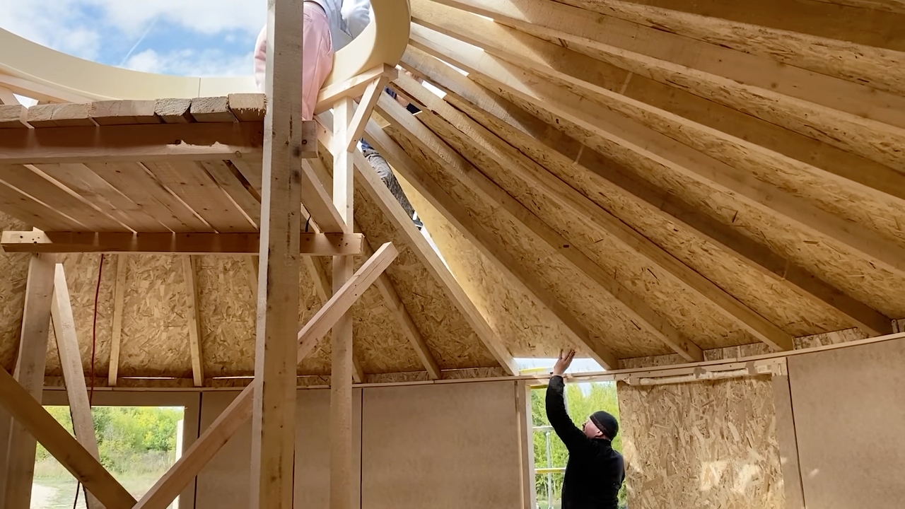 El montaje del techo utiliza el mismo principio que el resto de la construcción. Vigas inclinadas forman el diseño simple de la cubierta. Sobre ellas, entran paneles de madera prensada, uno a uno.