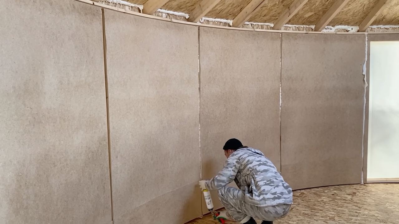 Los paneles están alineados por los bordes y fijados directamente a las vigas. La herramienta eléctrica trabaja sin parar. Los tornillos entran en secuencia, creando líneas visibles de fijación.
