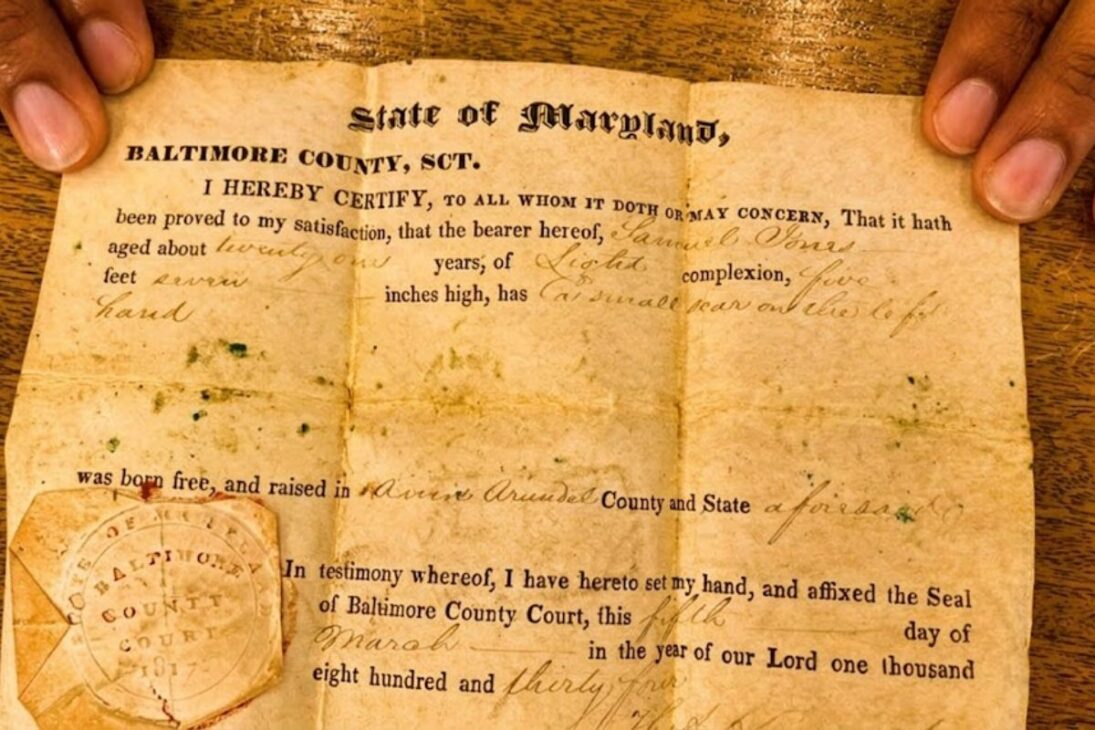 Entre la información central está el nombre: Samuel Jones. El registro señala que tenía 21 años cuando se firmó el documento y lo describe como un hombre negro nacido libre en el Condado de Anne Arundel, en Maryland. Este tipo de declaración, por sí sola, lleva un significado enorme en un país donde la esclavitud estructuró leyes, economía y relaciones sociales durante siglos.