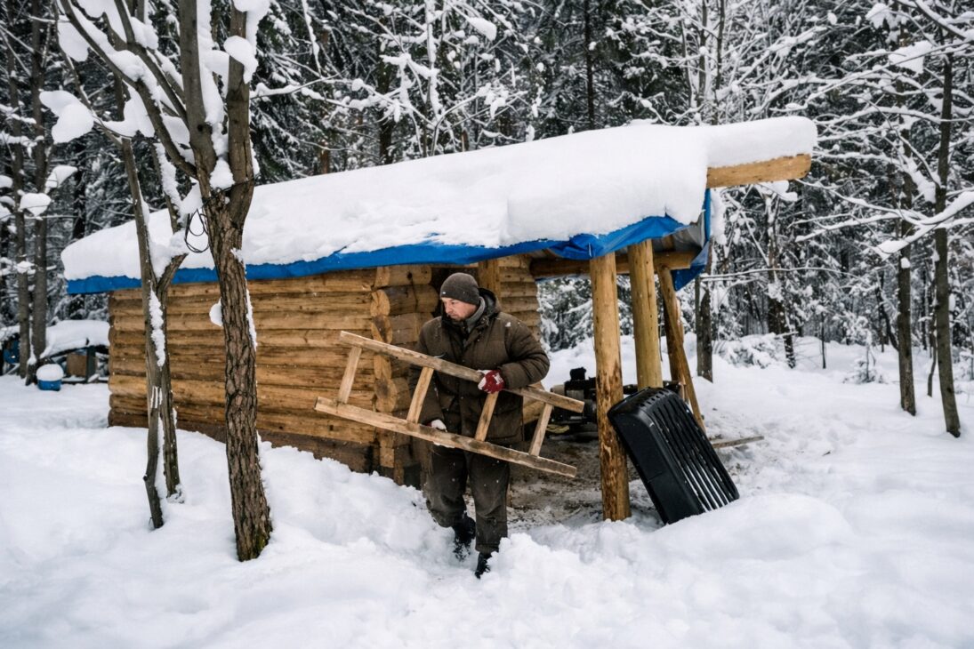 Nada llega listo. Sin camión entregando material, sin contratista para “resolver”, los amigos utilizan árboles, frío, barro, nieve para cerrar lo esencial antes que el invierno convierta cualquier atraso en problema. Y es ese detalle el que atrapa: no es un proyecto de fin de semana, es un año entero de insistencia.