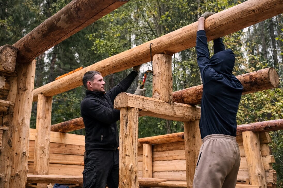 Misha y Sasha atraviesan un año de trabajo real, con repetición, error corregido y ajuste fino hasta que la casa deja de luchar contra ellos y comienza a responder. El factor técnico más decisivo es simple de entender: mantener la madera fuera del suelo, bien asentada, con la cubierta cerrada a tiempo.