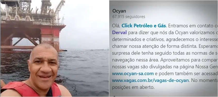 «Hola, Click Petróleo y Gás. Nos pusimos en contacto con Carlos Derval para decir que nosotros en Ocyan valoramos candidatos determinados y creativos, agradecemos su interés y la iniciativa de llamar nuestra atención de forma distinta. Esperamos que su visita sorpresa haya seguido todas las normas de seguridad para la navegación en esta área. Aprovechamos para compartir que todas nuestras vacantes son divulgadas en la página Nuestra Gente en nuestro sitio www.ocyan-sa.com y también pueden ser accedidas por www.vagas.com.br/vagas-de-ocyan. En este momento, tenemos 3 posiciones abiertas. «