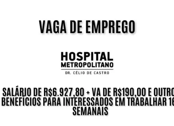 Si buscas vacantes de empleo en el área de la salud y deseas desempeñarte como psiquiatra en un hospital de gran porte, ¡esta es tu oportunidad! El Hospital Metropolitano Dr. Célio de Castro, en Belo Horizonte, está contratando Médico(a) Psiquiatra para un contrato temporal, con salario de R$6.927,80 para carga horaria de 80 horas mensuales.