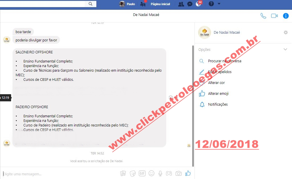 Empresa de hotelería offshore ubicada en la ciudad de Macaé, solicitó exclusivamente a Click Petróleo y Gás (CPG) que divulgáramos algunas de las oportunidades disponibles, con el fin de completar el cuadro de empleados de la firma. La solicitante es De Nadai Macaé, empresa especialista que actúa desde hace muchos años en esta modalidad, prestando servicios para diversas gigantes del petróleo brasileño. ¡Pero atención! A continuación, podrán consultar las vacantes y los requisitos para los cargos, no envíen si están fuera de ellos: