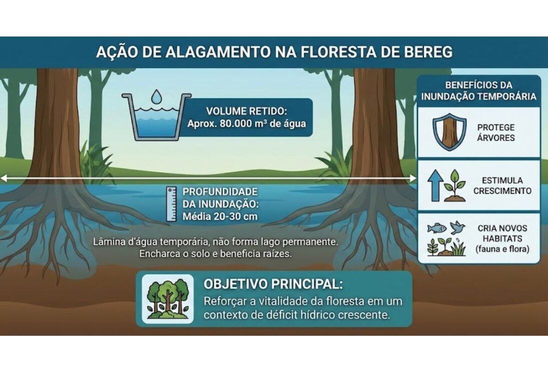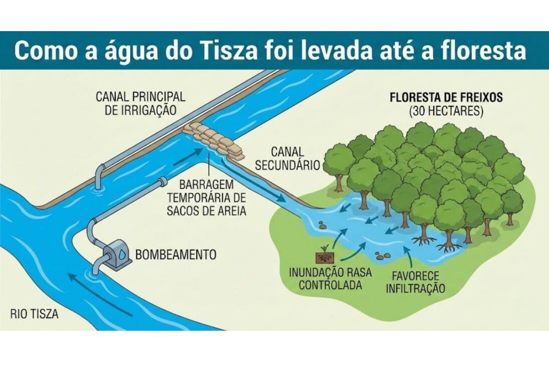 Proyecto Piloto Para Inundar Bosque De Fresnos En Bereg Usa Agua Del Tisza, Expande Lamina Rasa Sobre 30 Hectáreas Y Retiene 80 Mil Metros Cúbicos, Buscando Recargar Acuíferos, Proteger Árboles Y Aumentar La Resiliencia Climática Regional Frente A Sequías Persistentes Y Cambios Hidrológicos Profundos.
