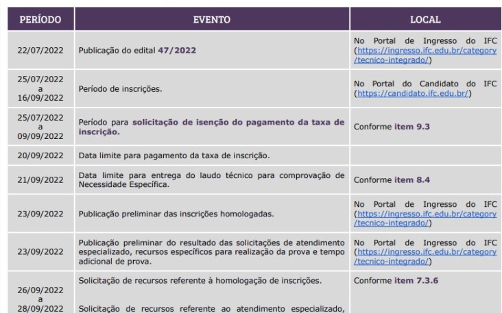 El día 23 de septiembre, habrá, a través del portal del Instituto Federal Catarinense (IFC), la publicación de un documento con lista de todas las inscripciones con nombres de los candidatos que deberán formar parte de la prueba.