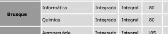 El Instituto Federal Catarinense, IFC, tiene 160 vacantes, según lo descrito por el edital publicado el mes pasado, para curso técnico integrado al ensino médio para química e informática, habrá 80 oportunidades para cada una de las áreas citadas. Podrán participar todos los candidatos con disponibilidad para estudiar presencialmente en horario completo en la ciudad de Brusque, incluidos aquellos que residen en ciudades vecinas como Guabiruba. Otros campus también tienen vacantes disponibles, incluyendo en las ciudades de Camboriú y Blumenau.