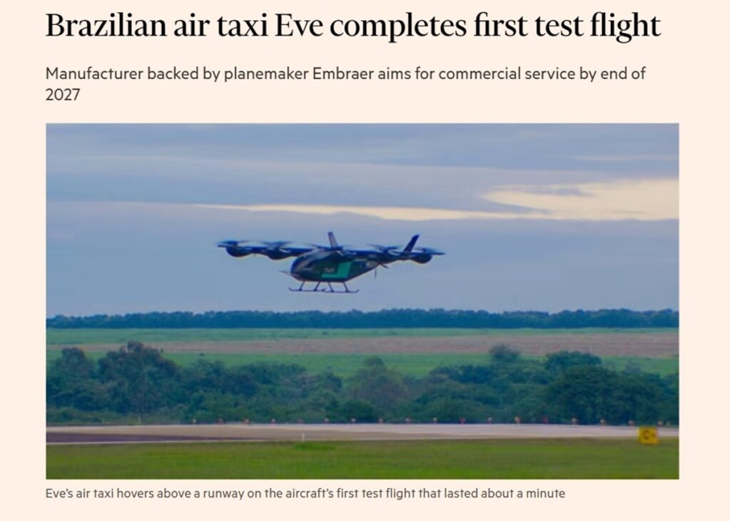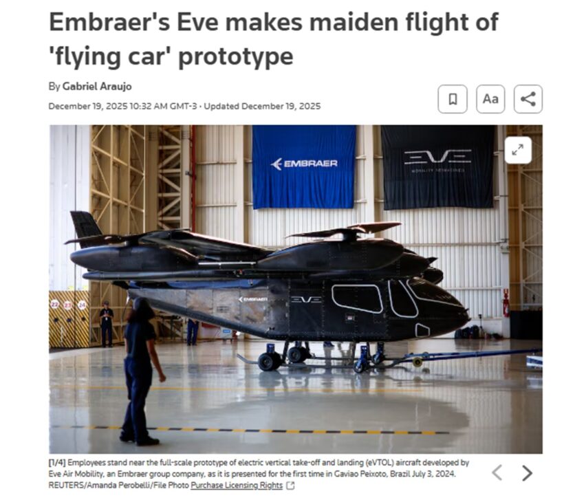 El primer vuelo del prototipo de coche volador de Eve Air Mobility, subsidiaria de Embraer, realizado el 19 de diciembre de 2025, en Gavião Peixoto, marcó el inicio de la campaña de pruebas en vuelo, validó sistemas críticos y ganó amplia repercusión en la prensa internacional especializada y generalista.