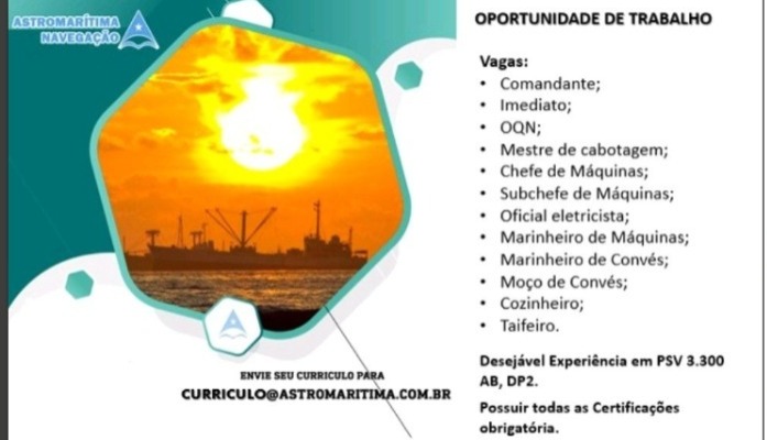 A Astromarítima Tiene Ofertas De Empleo Offshore Este Viernes, 22 De Julio, Disponibles Para Jefe De Máquinas, Oficial Electricista, Marinero, Taifeiro, Cocinero, Mozo De Cubierta Y Muchos Otros Con Y Sin Experiencia, Con La Solicitud Realizada A Través Del Correo Electrónico De La Institución: currículo@astromaritima.com.br. Las Oportunidades Están Destinadas A Candidatos Con Disponibilidad Para Trabajar En Macaé, Ciudad Ubicada En Río De Janeiro (RJ).