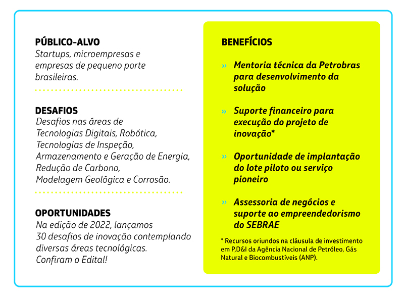 El proyecto tiene como objetivo crear soluciones para 30 desafíos presentados por la estatal. Después del fin de la selección, las startups recibirán una cantidad de dinero que varía según la complejidad de la solución presentada. El público objetivo del programa son startups, microempresas y empresas nacionales de pequeño tamaño.