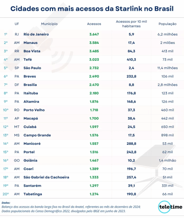 En total, Starlink está presente en 5.178 de los 5.570 municipios brasileños. Sin embargo, solo 738 ciudades cuentan con más de 100 accesos, y 100 municipios superan la marca de 500 suscriptores.