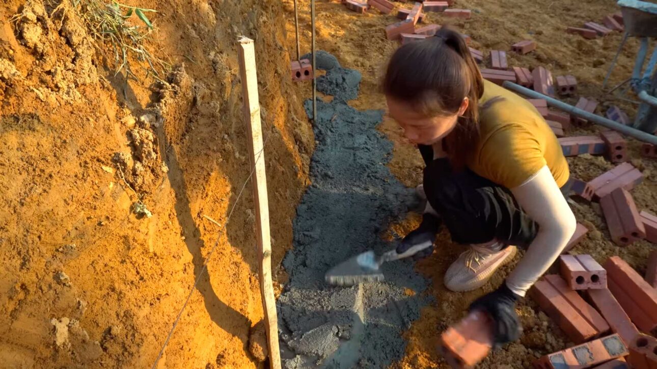 La escena tiene apariencia simple y, al mismo tiempo, fuera de lo común. Una joven trabajando sola, a un ritmo constante, para erigir una piscina de albañilería usando ladrillos, cemento y herramientas básicas, sin equipo y sin máquinas pesadas.