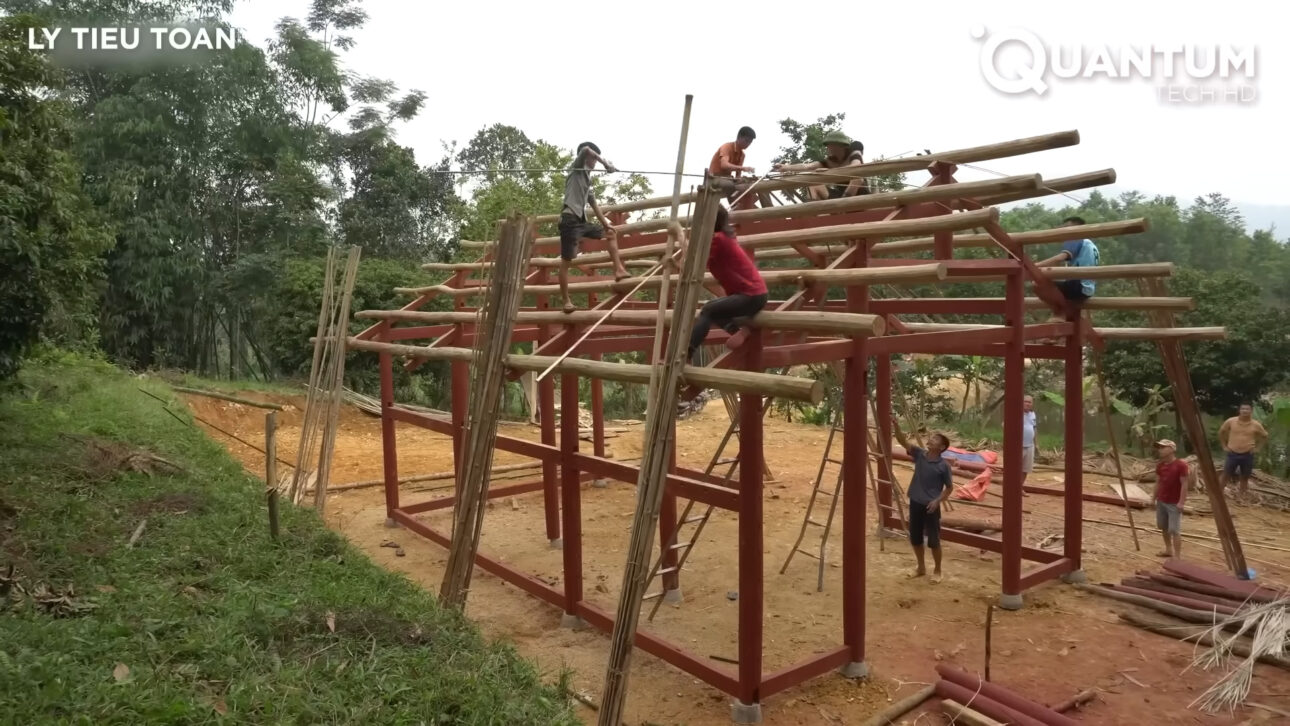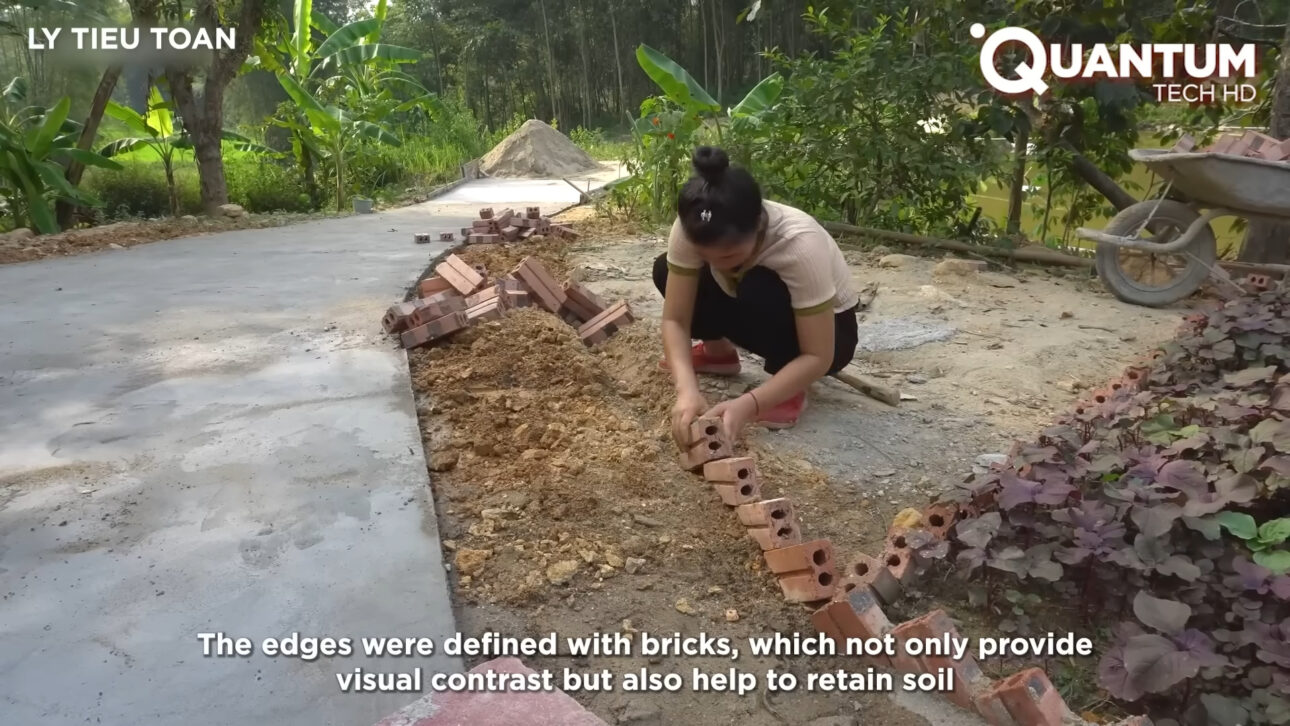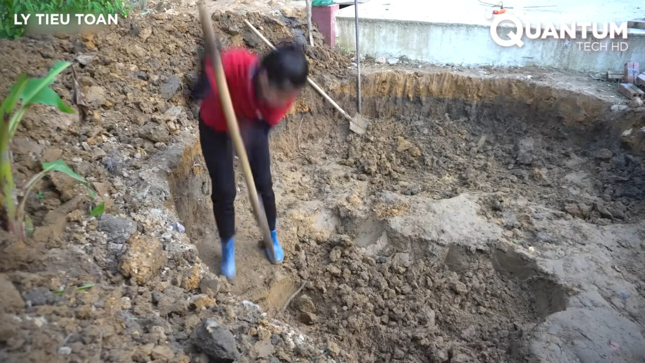 El proyecto, documentado por el canal @LyTieuToan, muestra una obra que no nace de la prisa, sino de la repetición paciente de gestos simples: limpiar la tierra, cortar madera, alinear ladrillos, moldear concreto, excavar el suelo. Cada etapa es ejecutada manualmente, sin máquinas pesadas, sin equipo fijo y sin desperdicios.