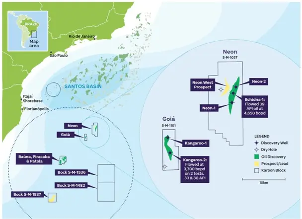 Ubicado en el bloque SM-1037, a aproximadamente 75 km al noreste del campo de Baúna, también operado por Karoon en la Cuenca de Santos, el campo de Neon es estratégico para el mantenimiento de la producción de la empresa en Brasil.