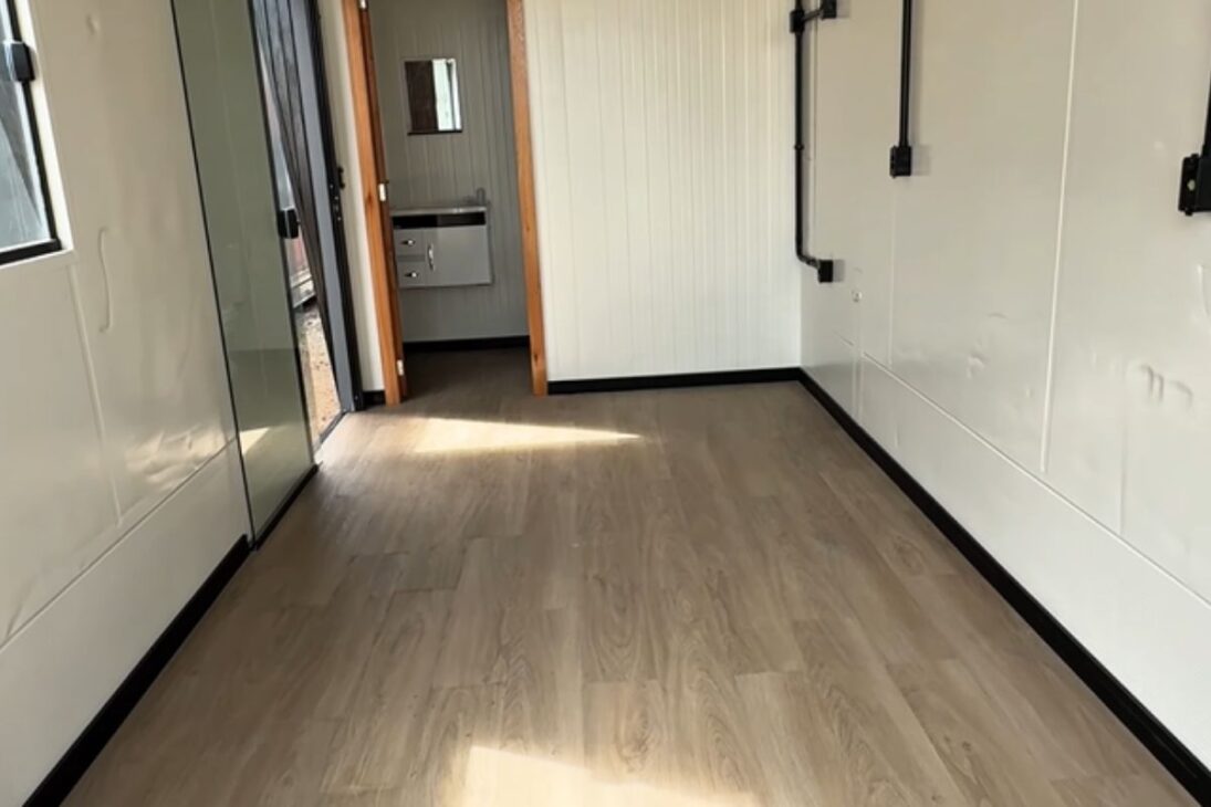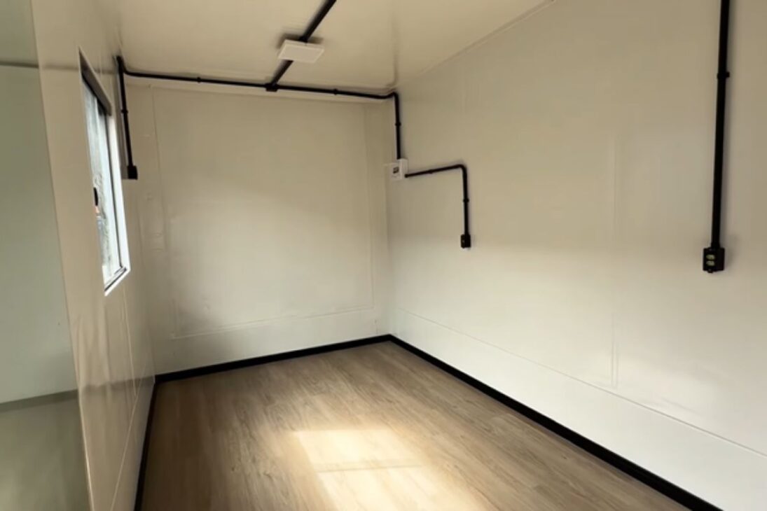 En el interior de la Kitnet container doble, el cliente eligió piso vinílico y zócalos en negro, combinación que entrega sensación de acogimiento y un acabado más sofisticado.