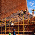 Uno de los mayores destacados del proyecto está en la fachada compuesta por 139.000 azulejos cerámicos personalizados, cada uno midiendo 60 por 60 por 180 mm.