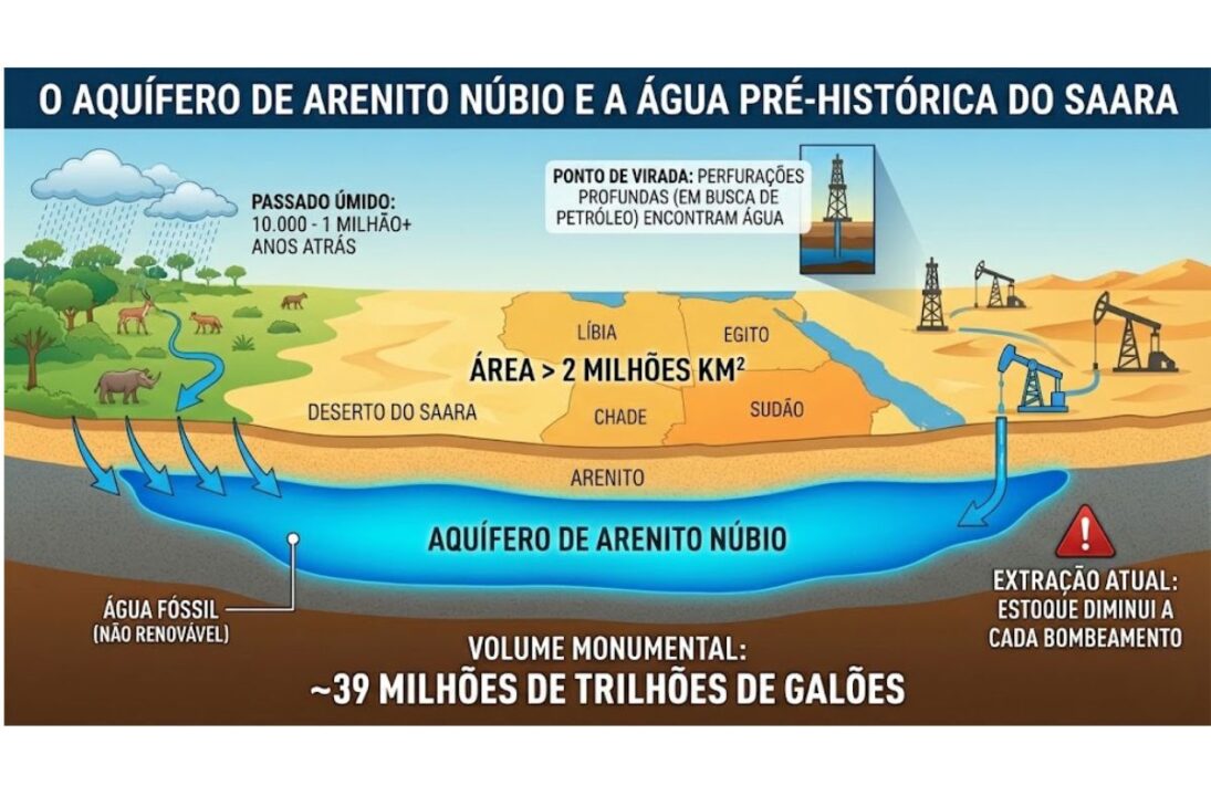 Las estimaciones citadas señalan una cantidad monumental, en el orden de 39 millones de billones de galones de agua. Y el detalle que cambia todo es la edad: esta agua se acumuló entre 10.000 y más de 1 millón de años, en un período en que el Sahara era más verde, húmedo y lleno de vida.