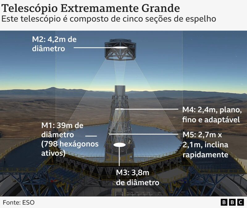 El espejo secundario, M2, con 4.25 metros de diámetro, es descrito como una verdadera obra de arte, mientras que el M4, el mayor espejo deformable jamás creado, puede ajustar su forma 1,000 veces por segundo para corregir distorsiones causadas por la atmósfera.