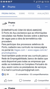 «Sólo Es Posible Participar En Procesos Selectivos Del Puerto Registrando El Currículo En El Portal De Vagas.com – www.vagas.com.br/prumologistica. También Puedes Enviar El Currículo A La Red De Empleabilidad – Banco De Datos Disponible Para Todas Las Empresas Que Operan En El Complejo Portuario Del Açu Y Prestadores De Servicios. El Correo De Contacto Es: currículo.porto@gmail.com», Se Escribió En El Comunicado!