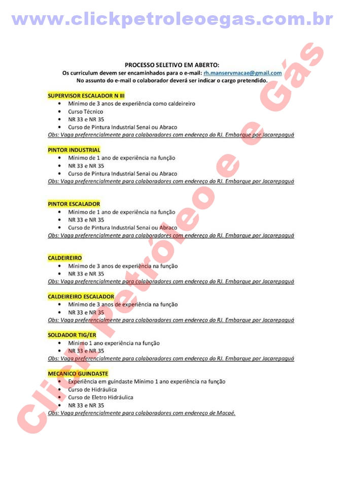 Los interesados y dentro de la función, deben enviar sus currículos a la dirección de correo electrónico rh.manservmacae@gmail.com, en el asunto del mensaje, el colaborador debe indicar el cargo deseado y la ciudad actual de su residencia. Indique en el mensaje que llegó por recomendación del sitio Click Petróleo y Gas. La lista original de los cargos se encuentra justo abajo: