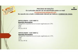 Si Eres Profesional Especializado En Alguna De Las Áreas Arriba, Cumples Con Los Requisitos De La Empresa Y Tienes Disponibilidad Para Trabajar En Río De Janeiro, Envía Tu Currículo A rh.manservmacae@gmail.com Informando En El Campo Asunto Del E-Mail, El Código De La Vacante. ¡Buena Suerte!