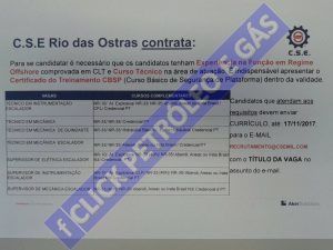 Para postularse, será necesario que todos tengan experiencia en régimen offshore comprobada en la cartera de trabajo y curso técnico en las áreas que se describirán a continuación. El Curso Básico de Seguridad en Plataforma (CBSP) debe estar dentro del plazo de validez y funcional. Las vacantes disponibles son para:
