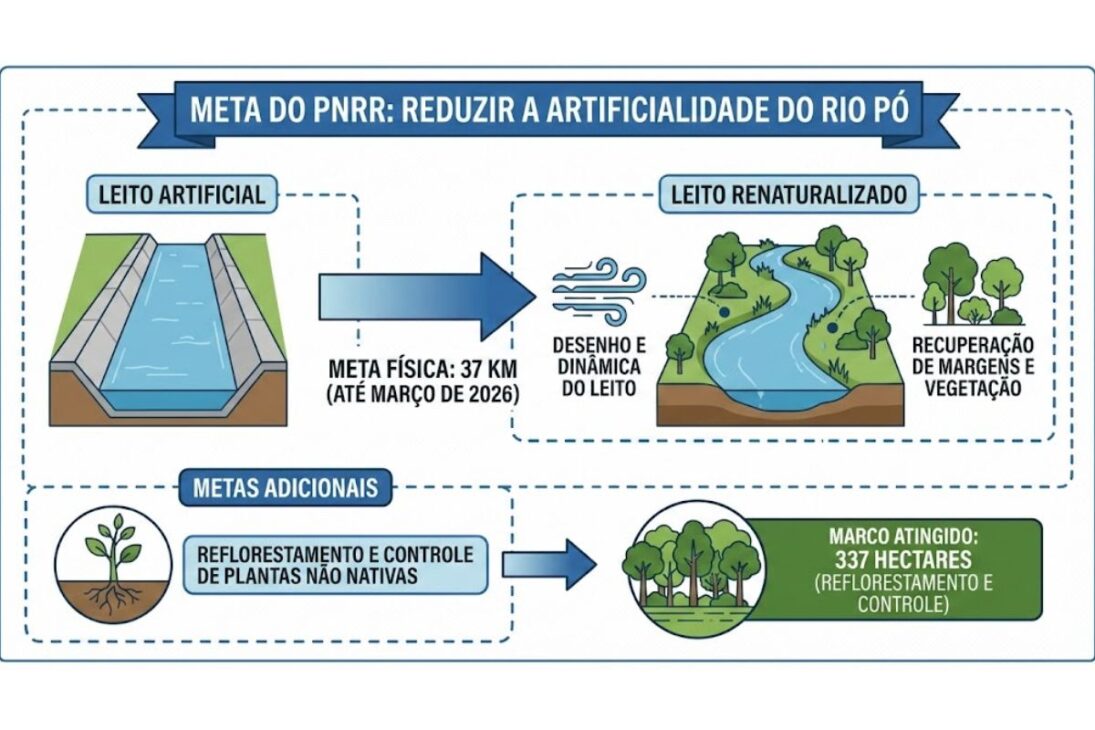 La meta establecida por la inversión es explícita: “reducción de la artificialidad del lecho del río Pó” en 37 km hasta marzo de 2026.