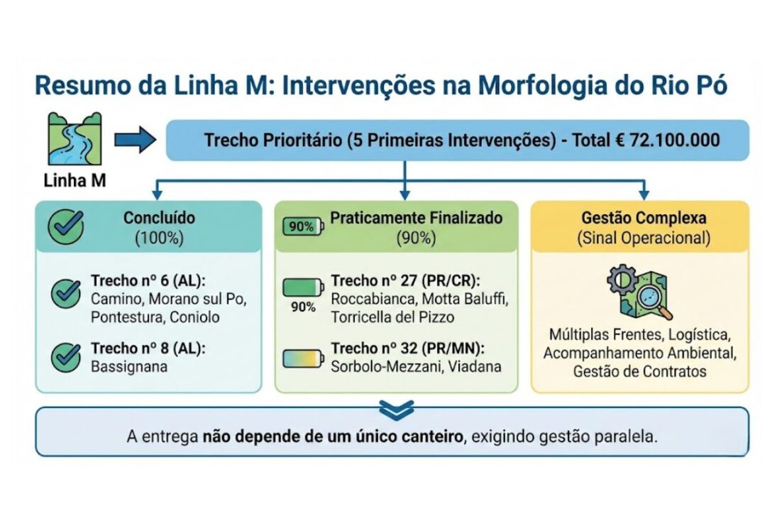 Estos porcentajes son una señal operacional importante porque indican que, en el diseño de ejecución del río Pó, la entrega no depende de un único canteiro, sino de múltiples frentes con etapas diferentes, exigiendo gestión de contratos, logística de obra y seguimiento ambiental en paralelo.