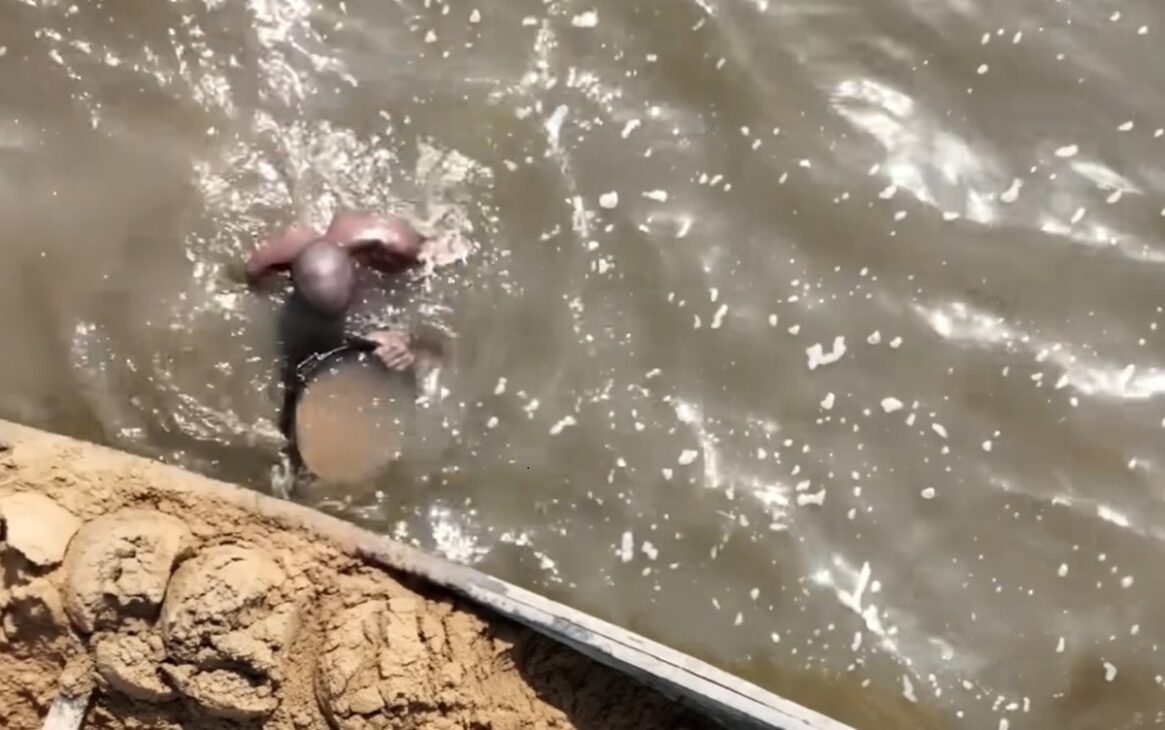 Elvis bucea en agua turbia, usando solo un short y un balde de acero. Afirma trabajar como un hombre ciego, guiándose por la memorización del fondo, rutina repetida diariamente.