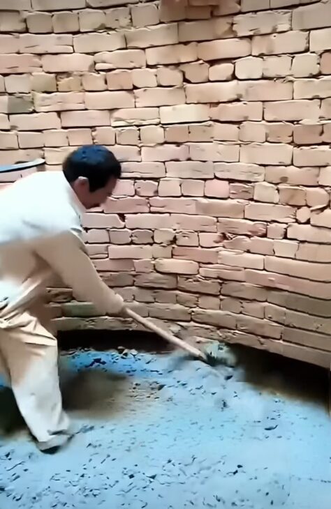Este movimiento gradual hace que el proceso sea más seguro, porque evita desmoronamientos, manteniendo las paredes estables mientras el pozo se profundiza. El trabajador repite el ciclo: excava, remueve el suelo, observa la estructura hundirse y continúa el trabajo.