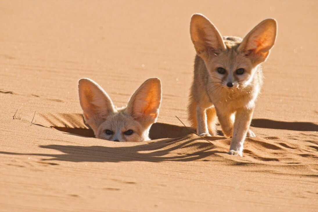 En El Sahara, un mar de arena con cinco millones y medio de millas cuadradas y seis por ciento de las tierras del planeta, la zorra del desierto o feneco sobrevive con un cuerpo pequeño que mide entre 20 y 40 cm de longitud (sin contar la cola de hasta 15 cm) y pesa entre 600g y 1,5 kg, con orejas llenas de venas y túneles firmes al pie de las dunas, sin sombra constante.