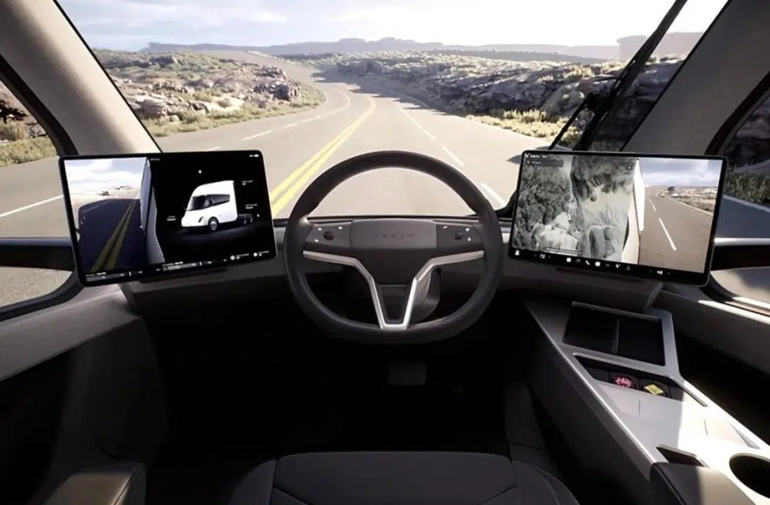 Enfocándose en la seguridad y en la experiencia del conductor, el Tesla Semi, el modelo de camión de la empresa, introduce una cabina con posición central para el conductor. Esta disposición asegura una visión panorámica de la vía, eliminando obstrucciones típicas encontradas en cabinas y capós de camiones convencionales. El diseño prioriza el confort y la visibilidad, con controles mayormente digitales exhibidos en grandes pantallas de infotainment, facilitando la operación y el acceso a los sistemas del vehículo.