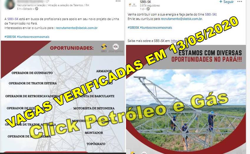 Muchas vacantes de empleo en diversas funciones para atender proyectos de Línea de Transmisión en Pará, de la SBEI-SK – una “joint venture” entre empresas tradicionales en el desarrollo de infraestructura del sector eléctrico. Soldador, calderero y profesionales PCD’s convocados con URGENCIA hoy (13) por Demuth Máquinas Industriales